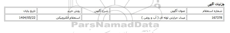 | 167378 | مبدل حرارتی لوله ای ( آب و روغن ) | استعلام الکترونیکی | 1404/05/22 |
