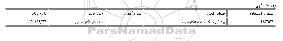| 167382 | پره فن خنک کننده الکتروموتور | استعلام الکترونیکی | 1404/05/22 |