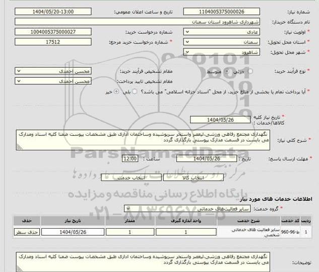 * شرح کلی نیاز: نگهداری مجتمع رفاهی ورزشی، لیعصر و استخر سرپوشیده و ساختمان اداری طبق مشخصات پیوست ضمنا کلیه اسناد و مدارک می بایست در قسمت مدارک پیوستی بارگذاری گردد