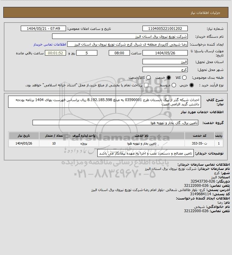 شرح کلی نیاز: احداث شبکه گذر از پیک تابستان طرح 03590001 به مبلغ 8.192.185.598 ریال براساس فهرست بهای 1404 برنامه بودجه داشتن گرید الزامی است