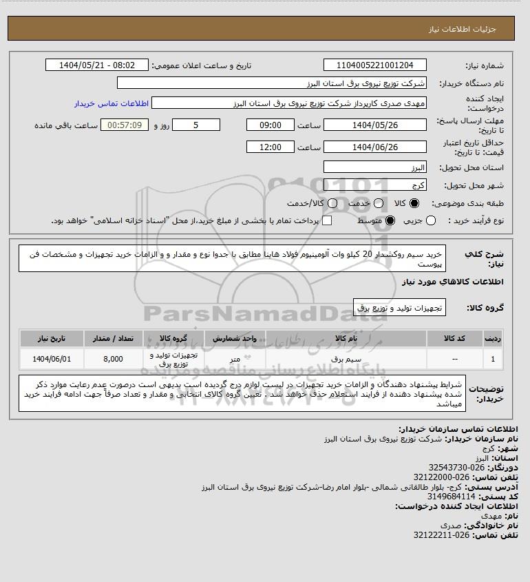 شرح کلی نیاز: خرید سیم روکشدار 20 کیلو وات آلومینیوم فولاد هاینا مطابق با جدوا نوع و مقدار و و الزامات خرید تجهیزات و مشخصات فن پیوست