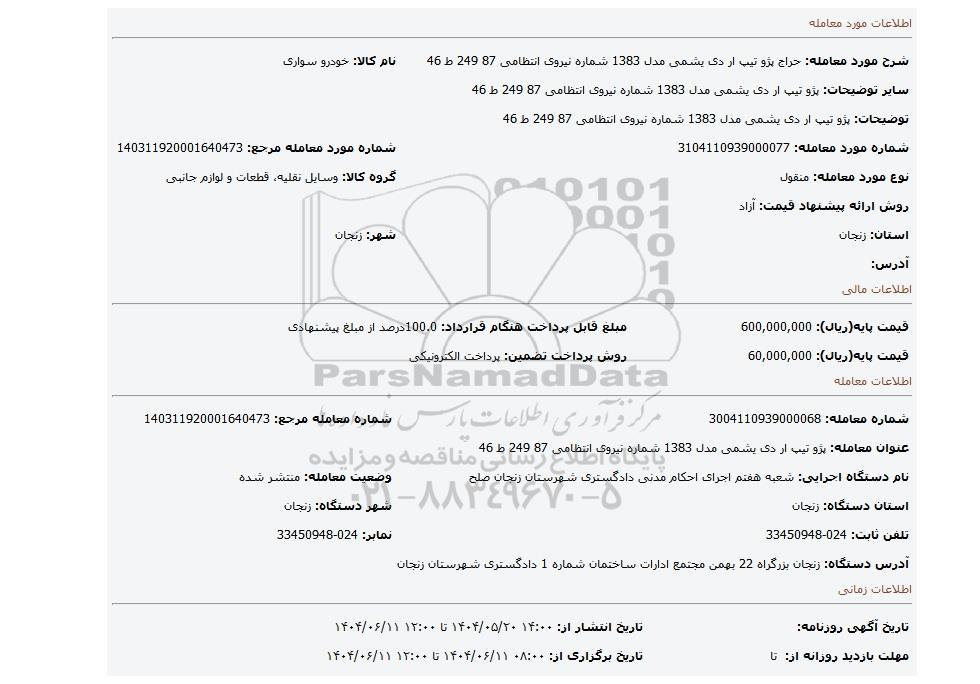 مزایده پژو تیپ ار دی یشمی مدل 1383 شماره نیروی انتظامی 87 249 ط 46, مزایده، پژو تیپ ار دی یشمی مدل 1383 شماره نیروی انتظامی 87 249 ط 46