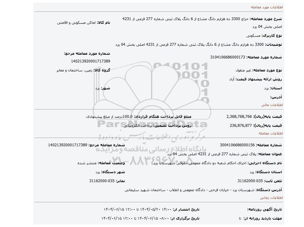 شرح مورد معامله: حراج 3300 ده هزارم دانگ مشاع از 6 دانگ پلاک ثبتی شماره 277 فرعی از 4231 اصلی بخش 04 یزدنام کالا: اماکن مسکونی و اقامتی