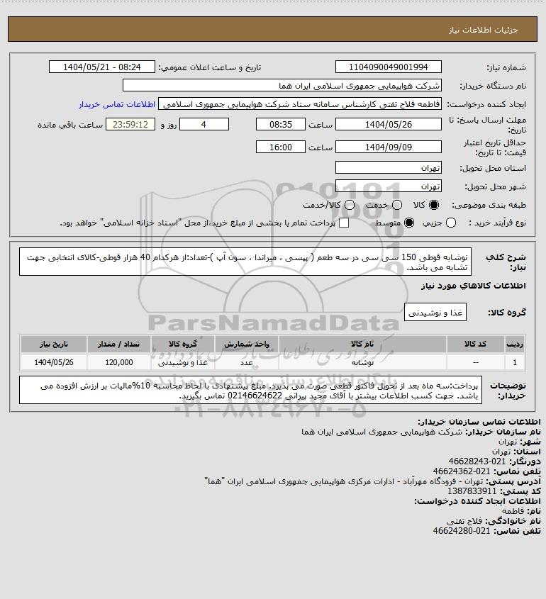 شرح کلی نیاز: نوشابه قوطی 150 سی سی در سه طعم ( پپسی ، میراندا ، سون آپ )-تعداد:از هرکدام 40 هزار قوطی-کالای انتخابی جهت تشابه می باشد.