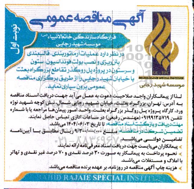 قرارگاه سازندگی خاتم الانبیاء (ص) موسسه شهید رجایی در نظر عملیات آرماتوربندی، قالب بندی بتن ریزی و نصب بولت فونداسیون، ستون و سرستون در پروژه پل روگذر تقاطع بزرگراه بعثت با خیابان شهید رجایی را از طریق برگزاری مناقصه عمومی برون سپاری نماید.