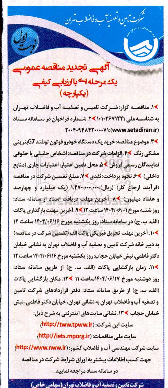 1- مناقصه گزار: شرکت تامین و تصفیه آب و فاضلاب تهران به شناسه ملی 10102671221