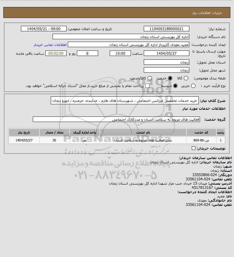 شرح کلی نیاز: خرید خدمات تخصصی اورژانس اجتماعی ، شهرستان های طارم ، خدابنده، خرمدره ، ابهرو زنجان