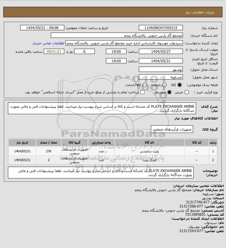 شرح کلی نیاز: PLATE EXCHANGER AMINE
