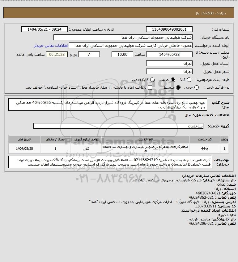 شرح کلی نیاز: تهیه ونصب تابلو برق سردخانه های هما در کیترینگ فرودگاه شیراز-بازدید الزامی میباشدزمان یکشنبه 404/05/26 هماهنگی جهت بازدید یک روزقبل ازبازدید.