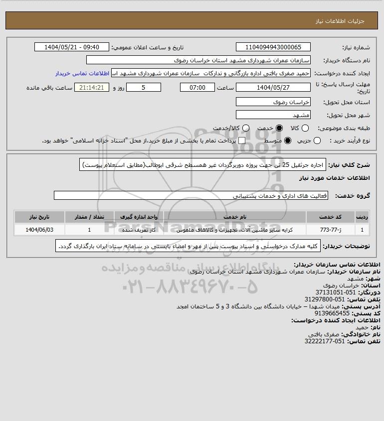 شرح کلی نیاز: اجاره جرثقیل 25 تن جهت پروژه دوربرگردان غیر همسطح شرقی ابوطالب(مطابق استعلام پیوست)