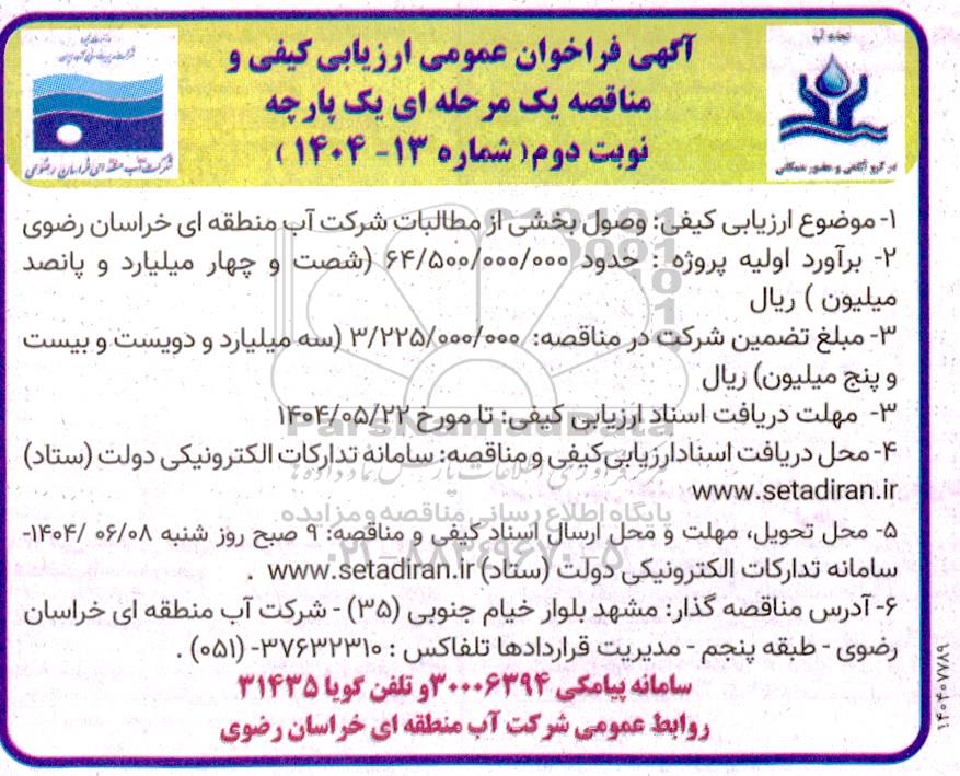 فراخوان وصول بخشی از مطالبات شرکت آب منطقه ای خراسان رضوی- نوبت دوم از کلیه افراد متخصص و شرکتها واجد شرایط دعوت به عمل میآید در مناقصه با کد خبرگزاری پارس نماد: 9397685 شرکت نمایند.