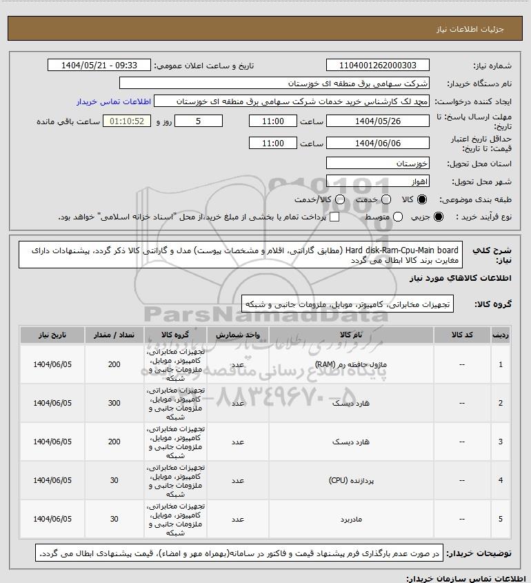 شرح کلی نیاز: Hard disk-Ram-Cpu-Main board (مطابق گارانتی، اقلام و مشخصات پیوست)