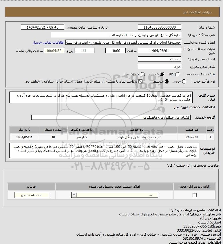 شرح کلی نیاز: اجرای کمربند حفاظتی بطول10 کیلومتر در مرز اراضی ملی و مستثنیات بوسیله نصب بنچ مارک در شهرستانهای خرم آباد و چگنی در سال 1404