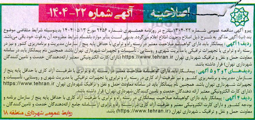 پیرو آگهی مناقصه عمومی شماره 22-1404 مندرج در روزنامه همشهری شماره 9456 مورخ 1404.05.13 بدینوسیله شرایط متقاضی موضوع بند (ب) آگهی مذکور به شرح ذیل اصلاح و جهت اطلاع اعلام میگردد. بدیهی است سایر موارد بانضمام شرایط مطروحه آن به قوت خود باقی میباشد.