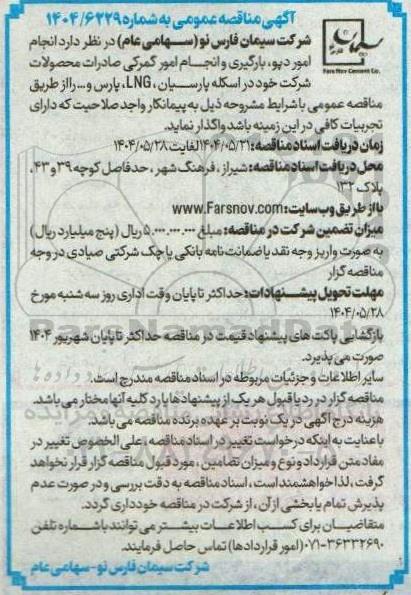 شرکت سیمان فارس نو (سهامی عام) در نظر دارد انجام امور دپو، بارگیری و انجام امور گمرکی صادرات محصولات شرکت خود در اسکله پارسیان ، LNG پارس و.... را از طریق مناقصه عمومی با شرایط مشروحه ذیل به پیمانکار واجد صلاحیت که دارای تجربیات کافی در این زمینه باشد واگذار نماید.
