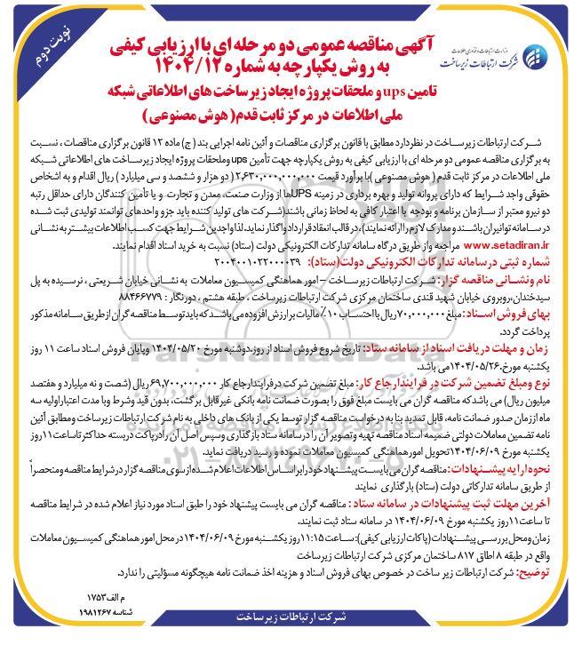 شرکت ارتباطات زیر ساخت در نظر دارد نسبت به برگزاری مناقصه عمومی دو مرحله ای با ارزیابی کیفی به روش یکپارچه جهت تامین UPS و ملحقات پروژه ایجاد زیر ساخت های اطلاعاتی شبکه ملی اطلاعات در مرکز ثابت قدم (هوش مصنوعی) با برآورد قیمت 2.630.000.000 (دو هزار و ششصد و سی میلیارد) ریال اقدام و به اشخاص حقوقی واجد شرایط که دارای پروانه تولید و بهره برداری در زمینه UPS ها از وزارت صنعت، معدن و تجارت و با تامین کنندگان دارای حداقل رتبه دو نیرو معتبر از سازمان برنامه و بودجه با اعتبار کافی به لحاظ زمانی باشند (شرکتهای تولید کنند ه باید جزو واحدهای توانمند تولیدی ثبت شده در سامانه توانیران باشند و مدارک لازم را ارائه نمایند)، در قالب انعقاد قرارداد واگذار نماید. لذا واجدین شرایط جهت کسب اطلاعات بیشتر به نشانی سایت ستاد ایران مراجعه و از طریق درگاه سامانه تدارکات الکترونیکی دولت (اسناد) نسبت به خرید اسناد اقدام نمایند.