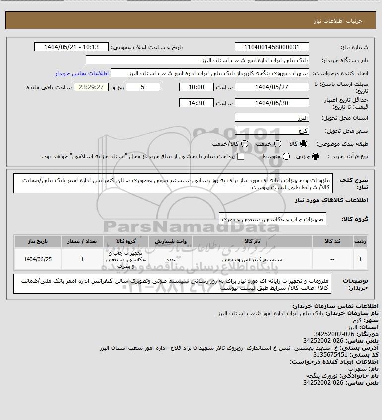 شرح کلی نیاز: ملزومات و تجهیزات رایانه ای مورد نیاز برای به روز رسانی سیستم صوتی وتصویری سالن کنفرانس اداره اممر بانک ملی/ضمانت کالا/ شرایط طبق لیست پیوست