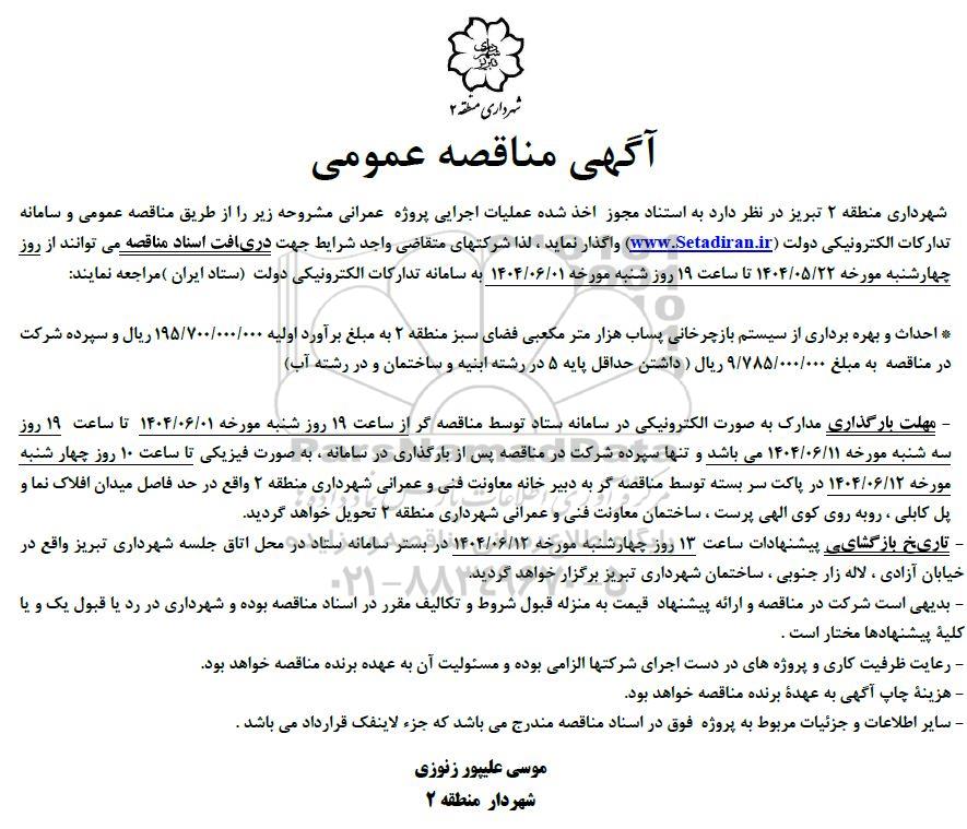 شهرداری منطقه 2 تبریز در نظر دارد به استناد مجوز اخذ شده عملیات اجرایی پروژه عمرانی مشروحه زیر را از طریق مناقصه عمومی و سامانه تدارکات الکترونیکی دولت ستاد ایران واگذار نماید ، لذا شرکتهای متقاضی واجد شرایط جهت دریافت اسناد مناقصه می توانند از روز چهارشنبه مورخه 1404.5.22 تا ساعت 19 روز شنبه مورخه 1404.6.1 به سامانه تدارکات الکترونیکی دولت ستاد ایران مراجعه نمایند