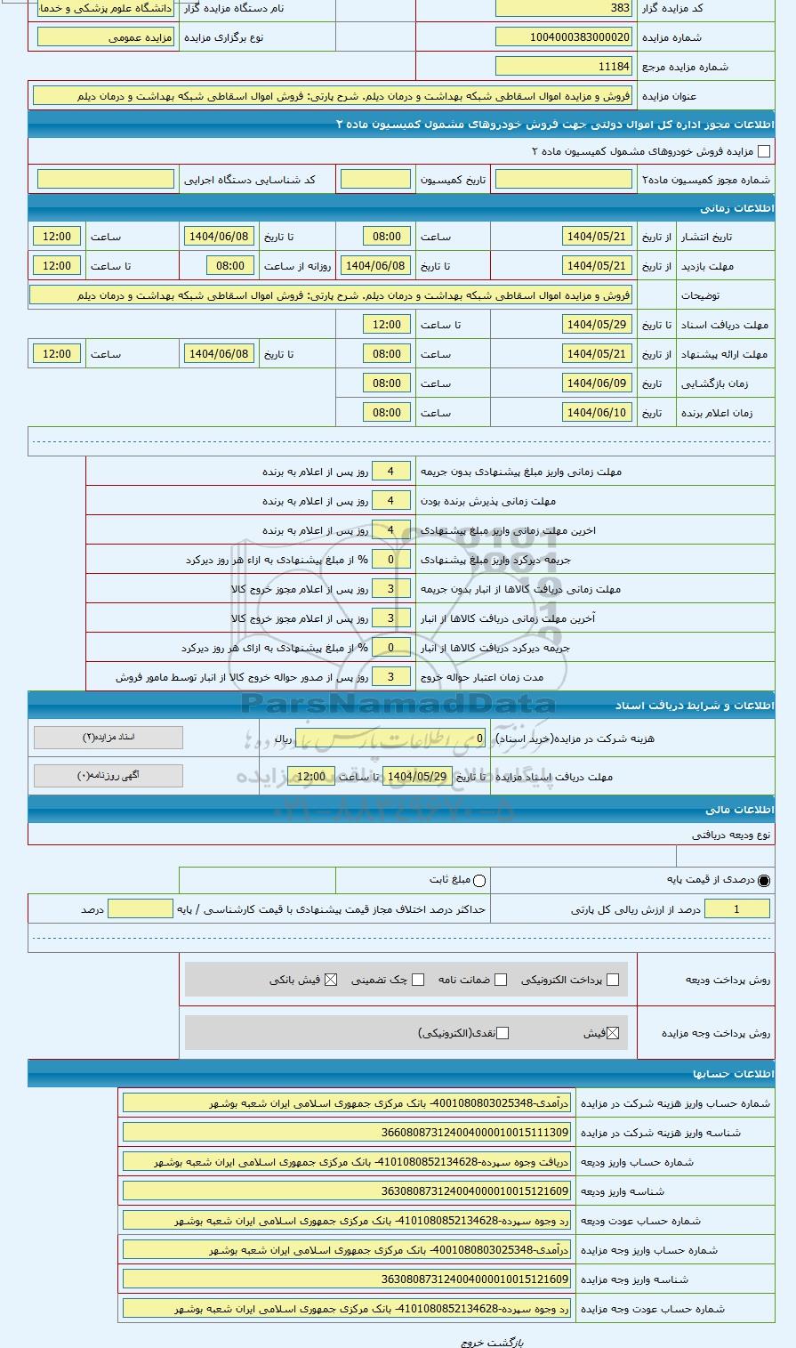 | شرح پارتی | فروش اموال اسقاطی شبکه بهداشت و درمان دیلم | |||