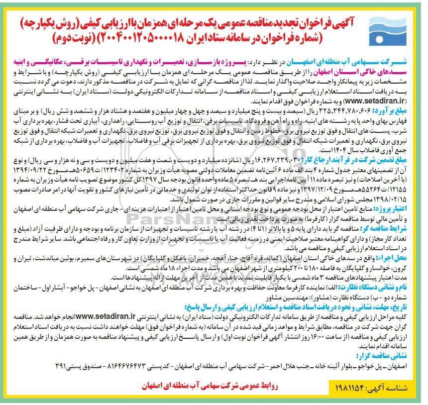 شرکت سهامی آب منطقه ای اصفهان در نظر دارد پروژه بازسازی، تعمیرات و نگهداری تاسیسات برقی، مکانیکی و ابنیه سدهای خاکی استان اصفهان را از طریق مناقصه عمومی یک مرحله ای همزمان با ارزیابی کیفی (روش یکپارچه) و با شرایط و مشخصات زیر به پیمانکار واجد صلاحیت واگذار نماید. لذا از مناقصه گرانی که تمایل به شرکت در مناقصه مذکور دارند دعوت می گردد نسبت به دریافت اسناد استعلام ارزیابی کیفی و اسناد مناقصه از سامانه تدارکات الکترونیکی دولت (ستاد ایران) و به شماره فراخوان فوق اقدام نمایند.