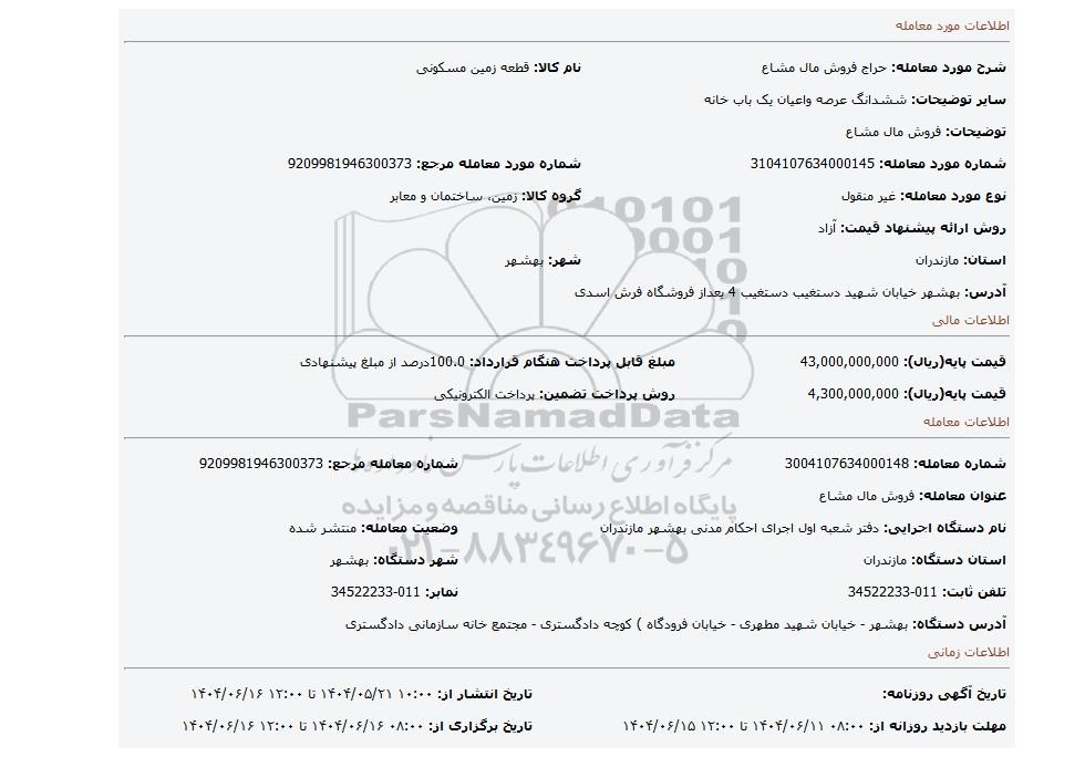 | شماره مورد معامله: 3104107634000145 | شماره مورد معامله مرجع: 9209981946300373 | |