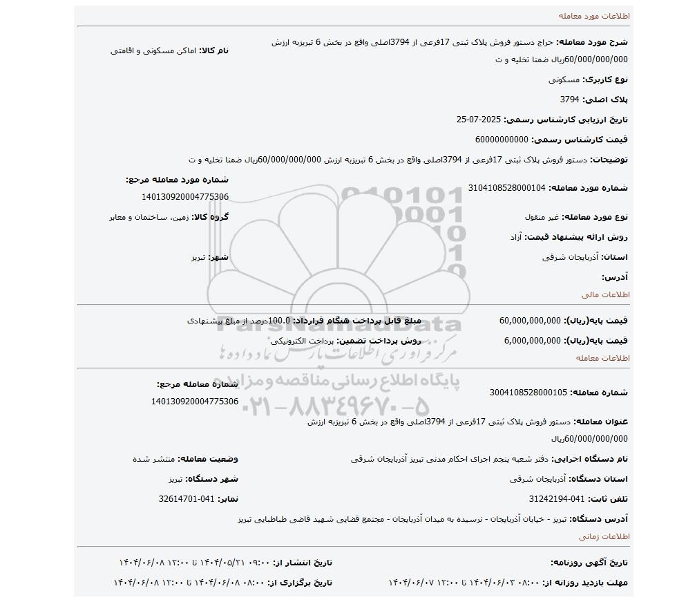 | شرح مورد معامله: حراج دستور فروش پلاک ثبتی 17فرعی از 3794اصلی واقع در بخش 6 تبریزبه ارزش 60/000/000/000ریال ضمنا تخلیه و ت | نام کالا: اماکن مسکونی و اقامتی | |