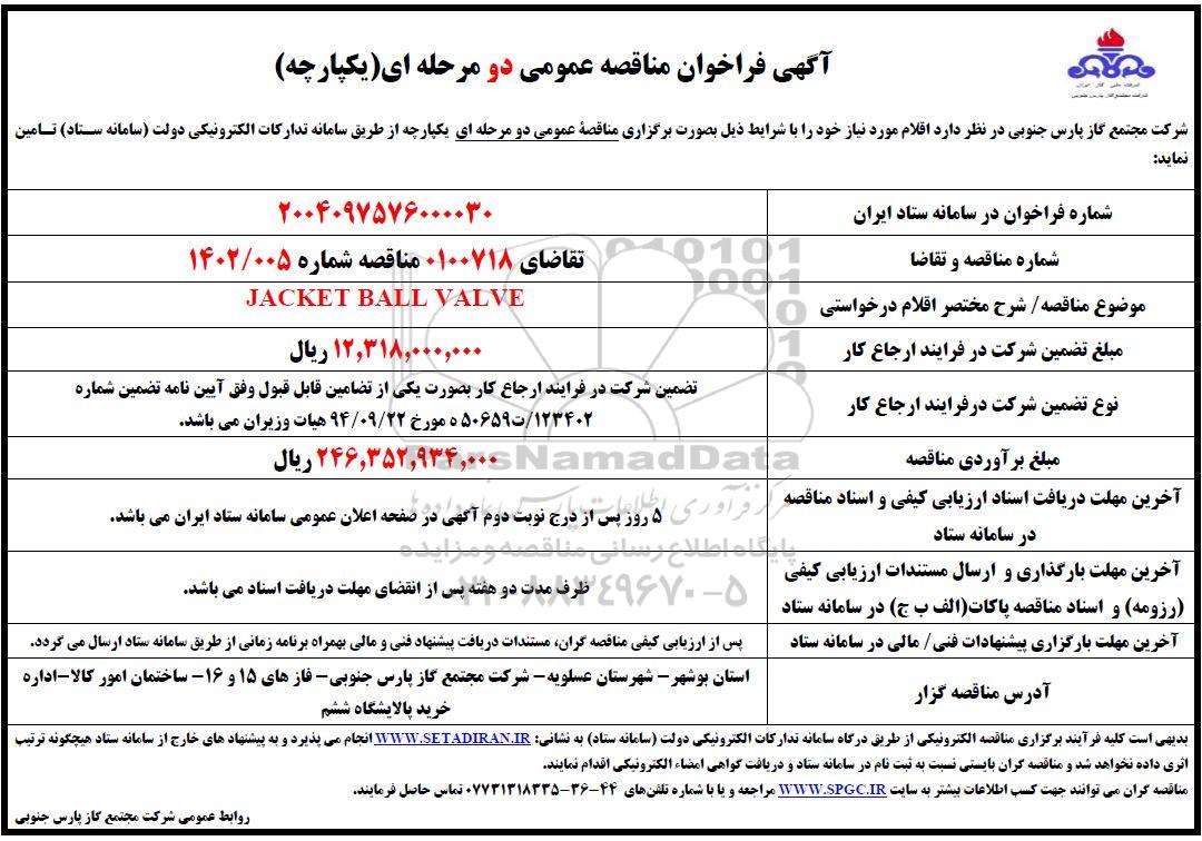 مناقصه عمومی JACKET BALL VALVE از کلیه افراد متخصص و شرکتها واجد شرایط دعوت به عمل میآید در مناقصه با کد خبرگزاری پارس نماد: 9398212 شرکت نمایند.