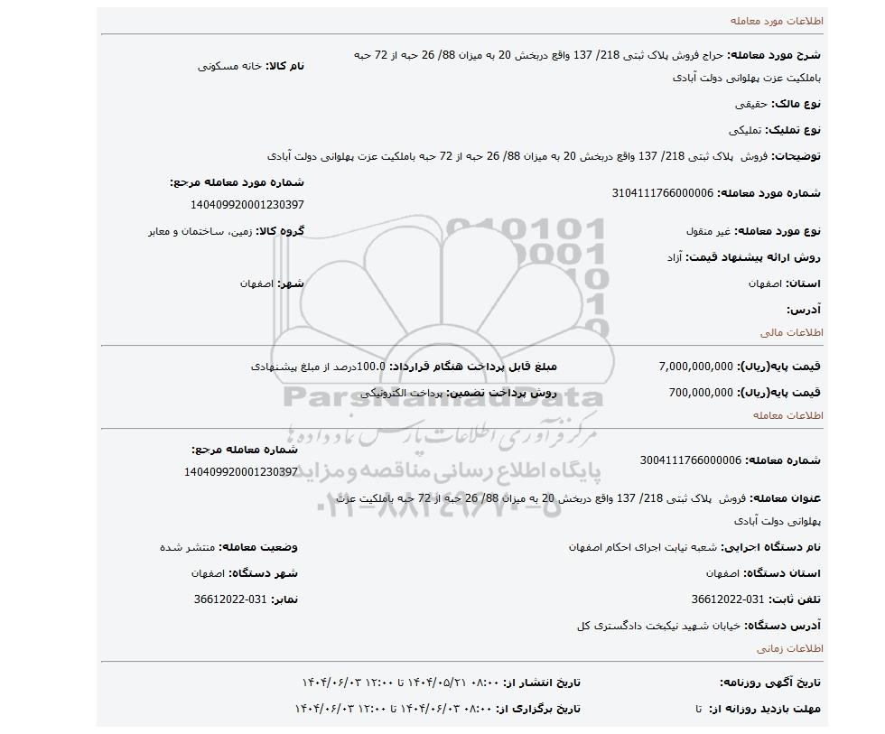 | عنوان معامله: فروش پلاک ثبتی 218/ 137 واقع دربخش 20 به میزان 88/ 26 حبه از 72 حبه باملکیت عزت پهلوانی دولت آبادی | ||