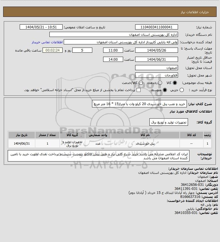 شرح کلی نیاز: خرید و نصب پنل خورشیدی 20 کیلو وات با متراژ15 * 16 متر مربع