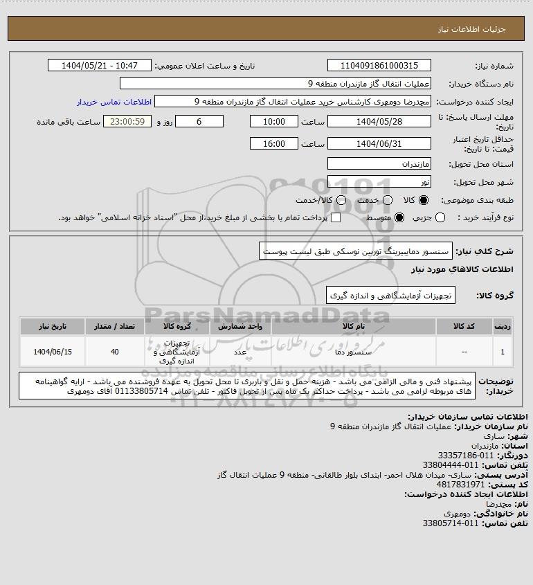 | 1 | -- | سنسور دما | عدد | تجهیزات آزمایشگاهی و اندازه گیری | 40 | 1404/06/15 |