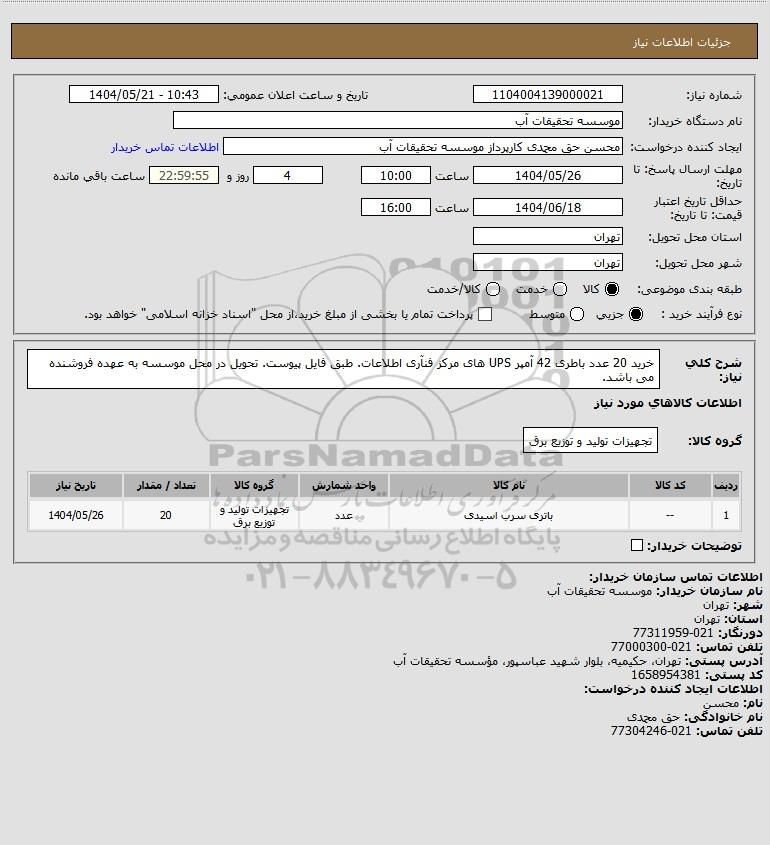 شرح کلی نیاز: خرید 20 عدد باطری 42 آمپر UPS های مرکز فنآری اطلاعات. طبق فایل پیوست.