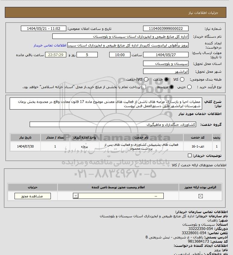 شرح کلی نیاز: عملیات احیا و بازسازی عرصه های ناشی از فعالیت های معدنی موضوع ماده 17 قانون معادن واقع در محدوده بخش بزمان شهرستان ایرانشهر طبق دستورالعمل فنی پیوست