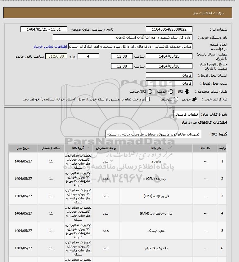 | 1 | -- | مادربرد | عدد | تجهیزات مخابراتی، کامپیوتر، موبایل، ملزومات جانبی و شبکه | 11 | 1404/05/27 |