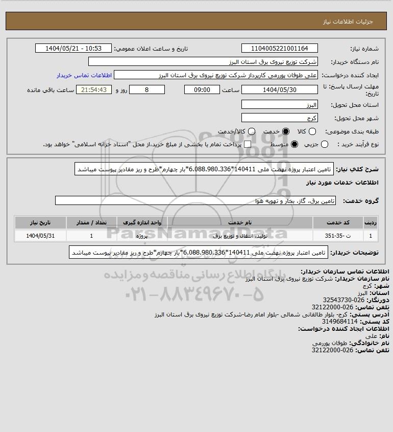 شرح کلی نیاز: تامین اعتبار پروژه نهضت ملی 140411*6.088.980.336*بار چهارم*طرح و ریز مقادیر پیوست میباشد