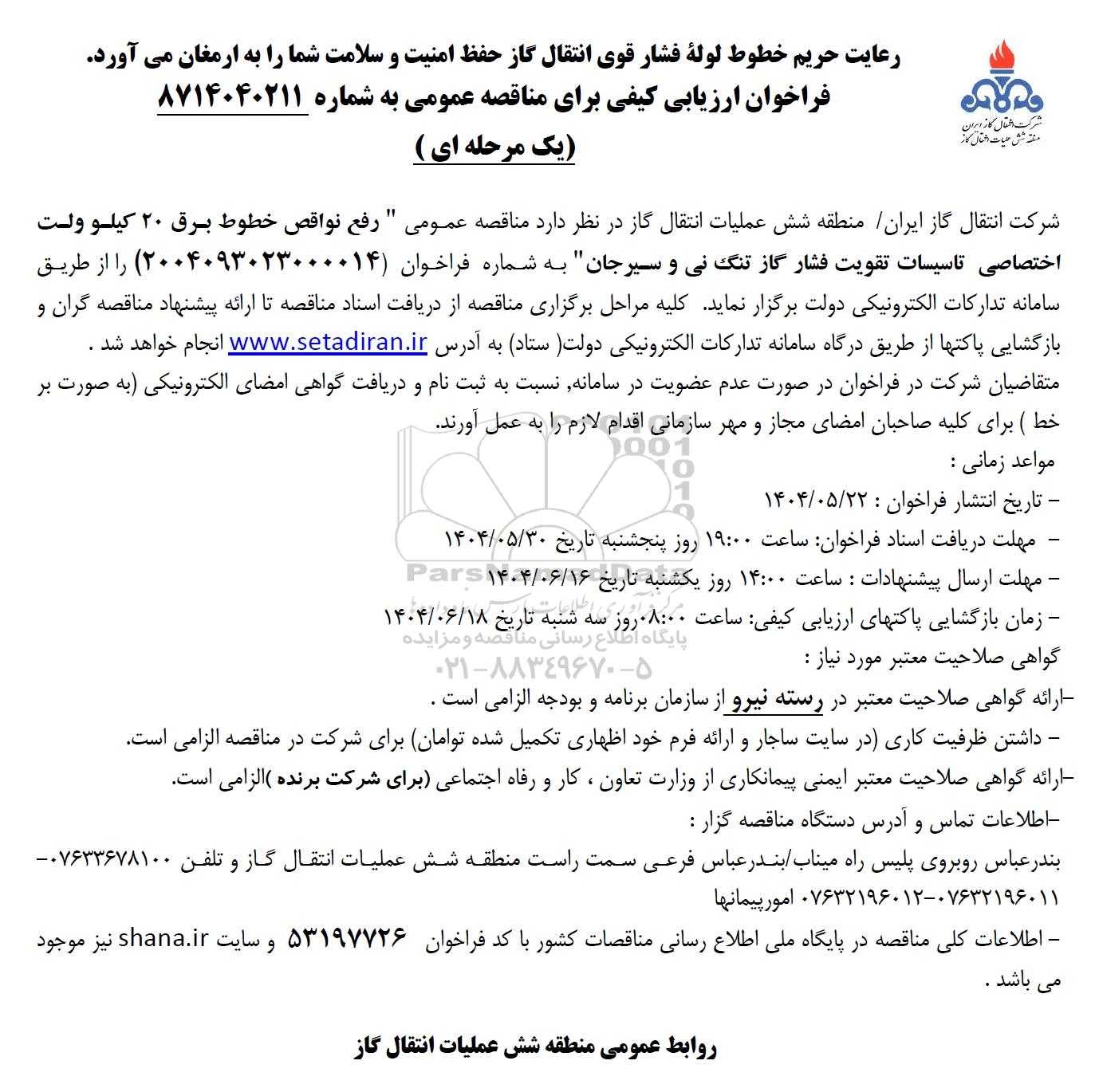 شرکت انتقال گاز ایران منطقه شش عملیات انتقال گاز در نظر دارد مناقصه عمومی رفع نواقص خطوط برق 20 کیلو ولت اختصاصی تاسیسات تقویت فشار گاز تنگ نی و سیرجان به شماره فراخوان 2004093023000014 را از طریق سامانه تدارکات الکترونیکی دولت برگزار نماید کلیه مراحل برگزاری مناقصه از دریافت اسناد مناقصه تا ارائه پیشنهاد مناقصه گران و بازگشایی پاکتها از طریق درگاه سامانه تدارکات الکترونیکی دولت ستاد به آدرس ستاد ایران انجام خواهد شد . متقاضیان شرکت در فراخوان در صورت عدم عضویت در سامانه نسبت به ثبت نام و دریافت گواهی امضای الکترونیکی به صورت (بر خط ) برای کلیه صاحبان امضای مجاز و مهر سازمانی اقدام لازم را به عمل آورند.