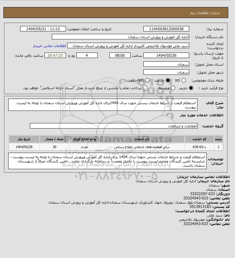 شرح کلی نیاز: استعلام قیمت و شرایط خدمات پستی جهت سال 1404برای اداره کل آموزش وپرورش استان سمنان با توجه به لیست پیوست