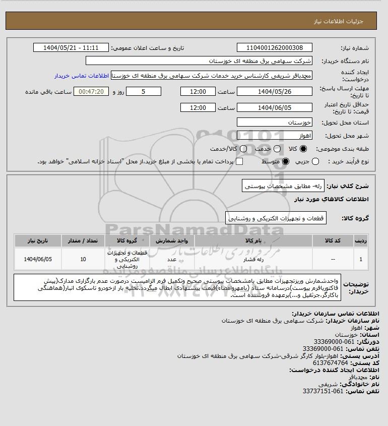 شرح کلی نیاز: رله- مطابق مشخصات پیوستی