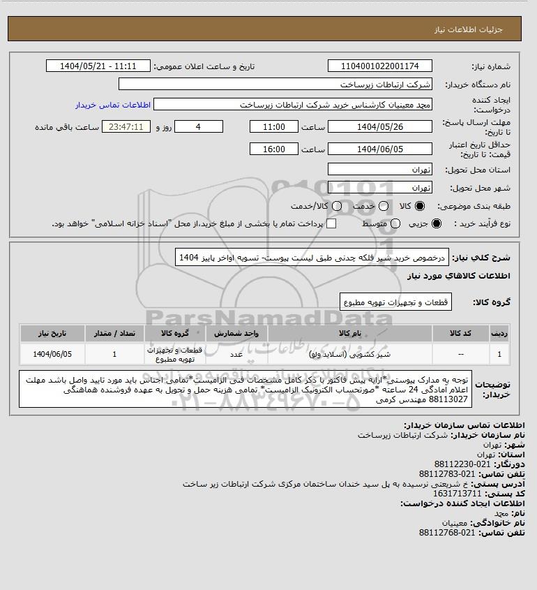 شرح کلی نیاز: درخصوص خرید شیر فلکه چدنی طبق لیست پیوست- تسویه اواخر پاییز 1404