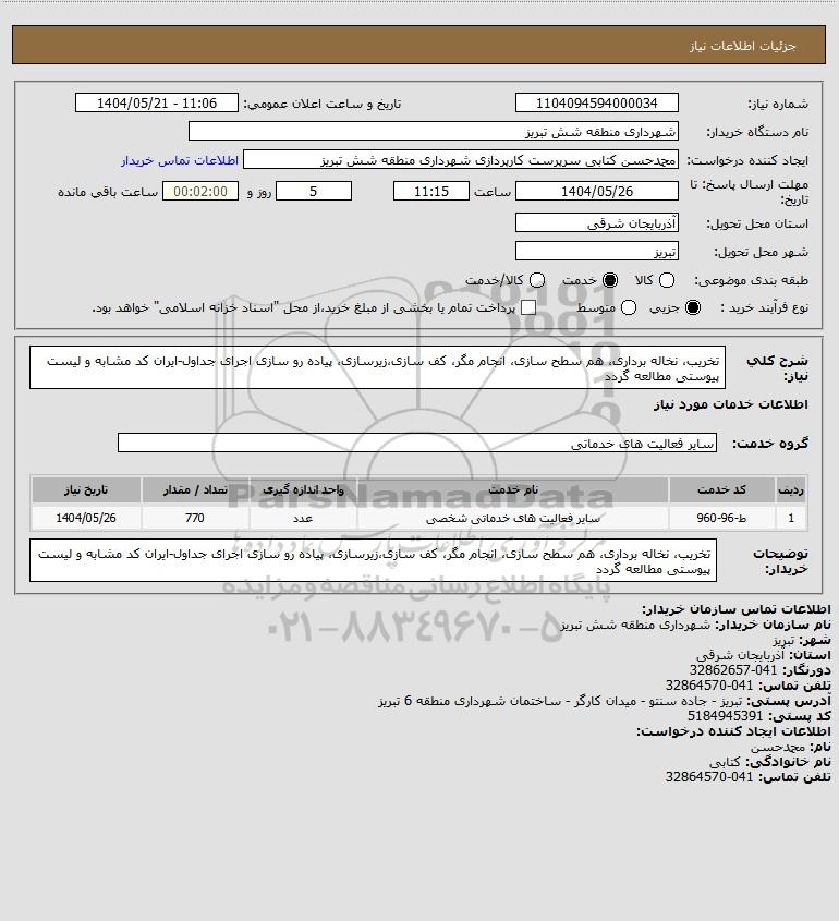 توضیحات خریدار:تخریب، نخاله برداری، هم سطح سازی، انجام مگر، کف سازی،زیرسازی، پیاده رو سازی اجرای جداول-ایران کد مشابه و لیست پیوستی مطالعه گردد