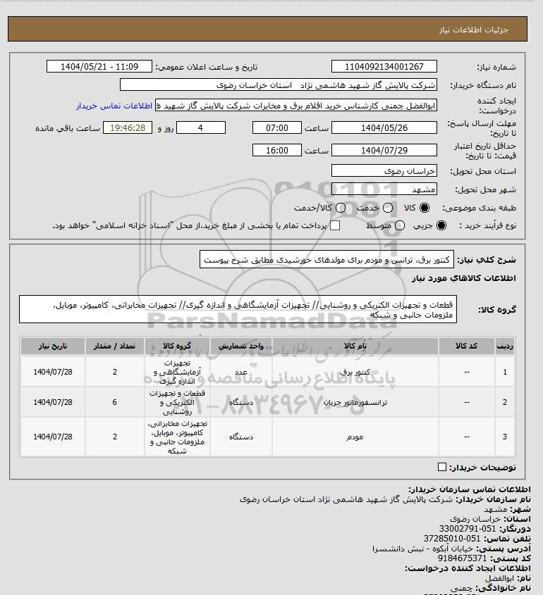شرح کلی نیاز: کنتور برق، ترانس و مودم برای مولدهای خورشیدی مطابق شرح پیوست