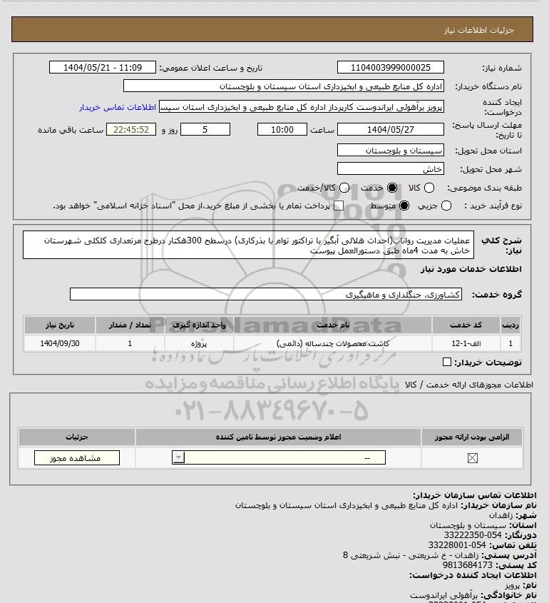 شرح کلی نیاز: عملیات مدیریت رواناب(احداث هلالی آبگیر با تراکتور توام با بذرکاری) درسطح 300هکتار درطرح مرتعداری کلکلی شهرستان خاش به مدت 4ماه طبق دستورالعمل پیوست