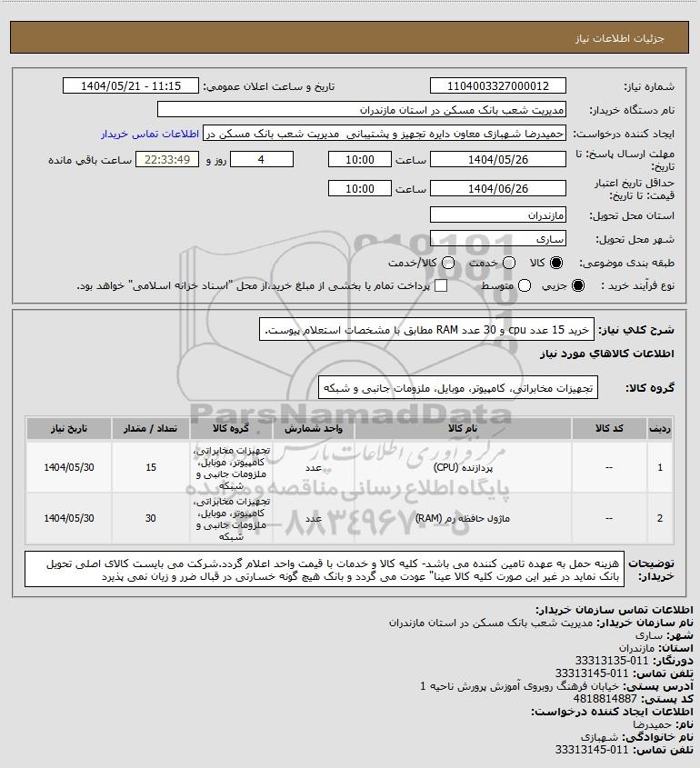 شرح کلی نیاز: خرید 15 عدد cpu و 30 عدد RAM مطابق با مشخصات استعلام پیوست.