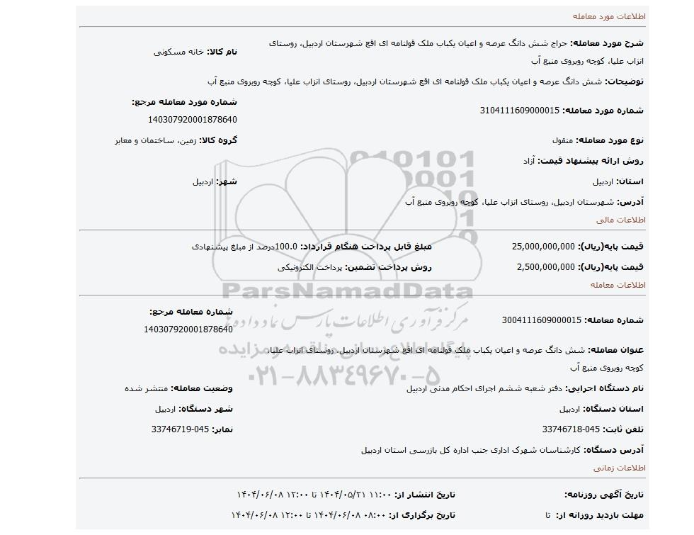 شرح مورد معامله: حراج شش دانگ عرصه و اعیان یکباب ملک قولنامه ای اقع شهرستان اردبیل، روستای انزاب علیا، کوچه روبروی منبع آب | نام کالا: خانه مسکونی | |