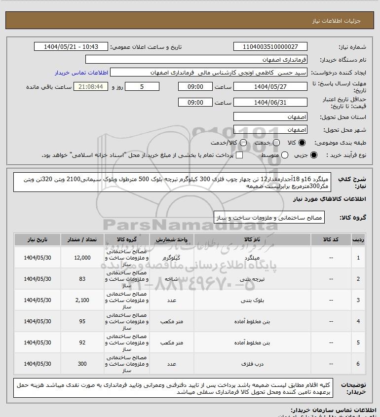| 1 | -- | میلگرد | کیلوگرم | مصالح ساختمانی و ملزومات ساخت و ساز | 12,000 | 1404/05/30 |