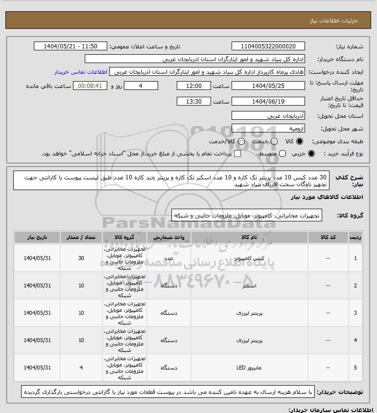 نام دستگاه خریدار:اداره کل بنیاد شهید و امور ایثارگران استان اذربایجان غربی