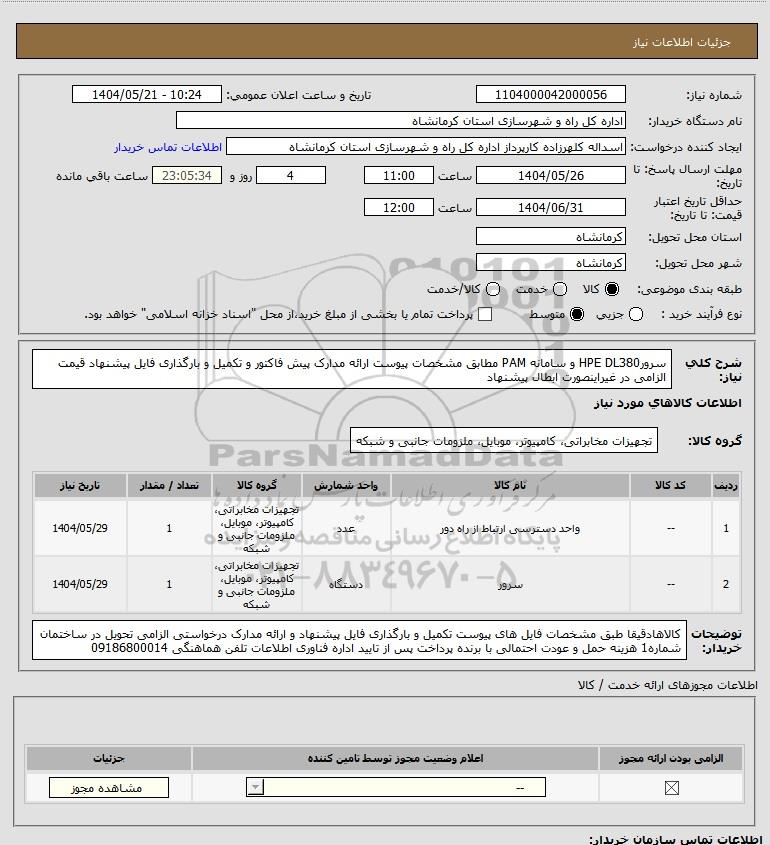 | 2 | -- | سرور | دستگاه | تجهیزات مخابراتی، کامپیوتر، موبایل، ملزومات جانبی و شبکه | 1 | 1404/05/29 |