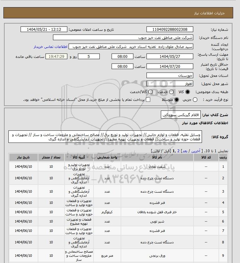 | 8 | -- | دستگاه تست چرخ دنده | عدد | تجهیزات آزمایشگاهی و اندازه گیری | 10 | 1404/06/10 |