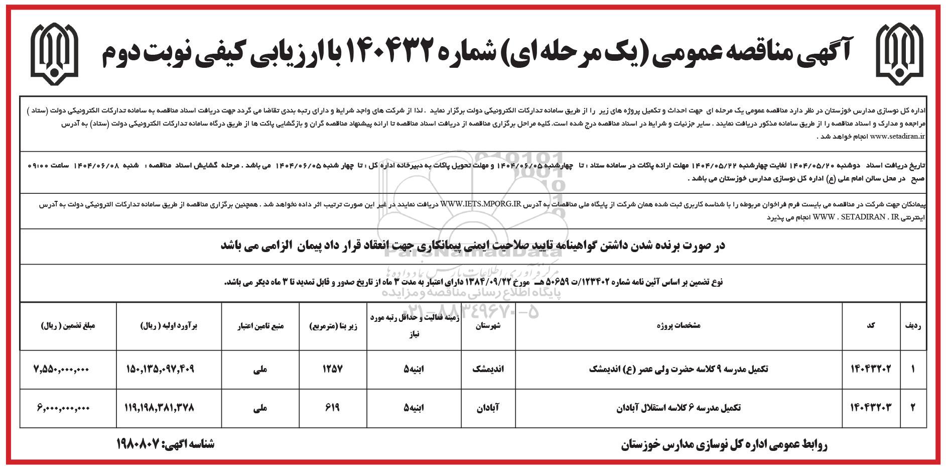 اداره کل نوسازی مدارس خوزستان در نظر دارد مناقصه عمومی یک مرحله ای جهت احداث و تکمیل پروژه های زیر را از طریق سامانه تدارکات الکترونیکی دولت برگزار نماید.