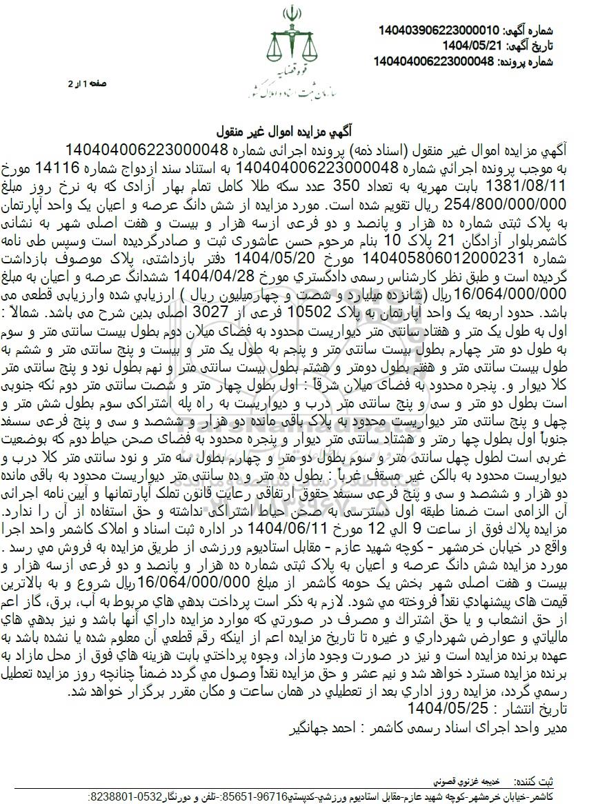 مزایده یک واحد آپارتمان به پلاک ثبتی شماره ده هزار و پانصد و دو فرعی از سه هزار و بیست و هفت اصلی