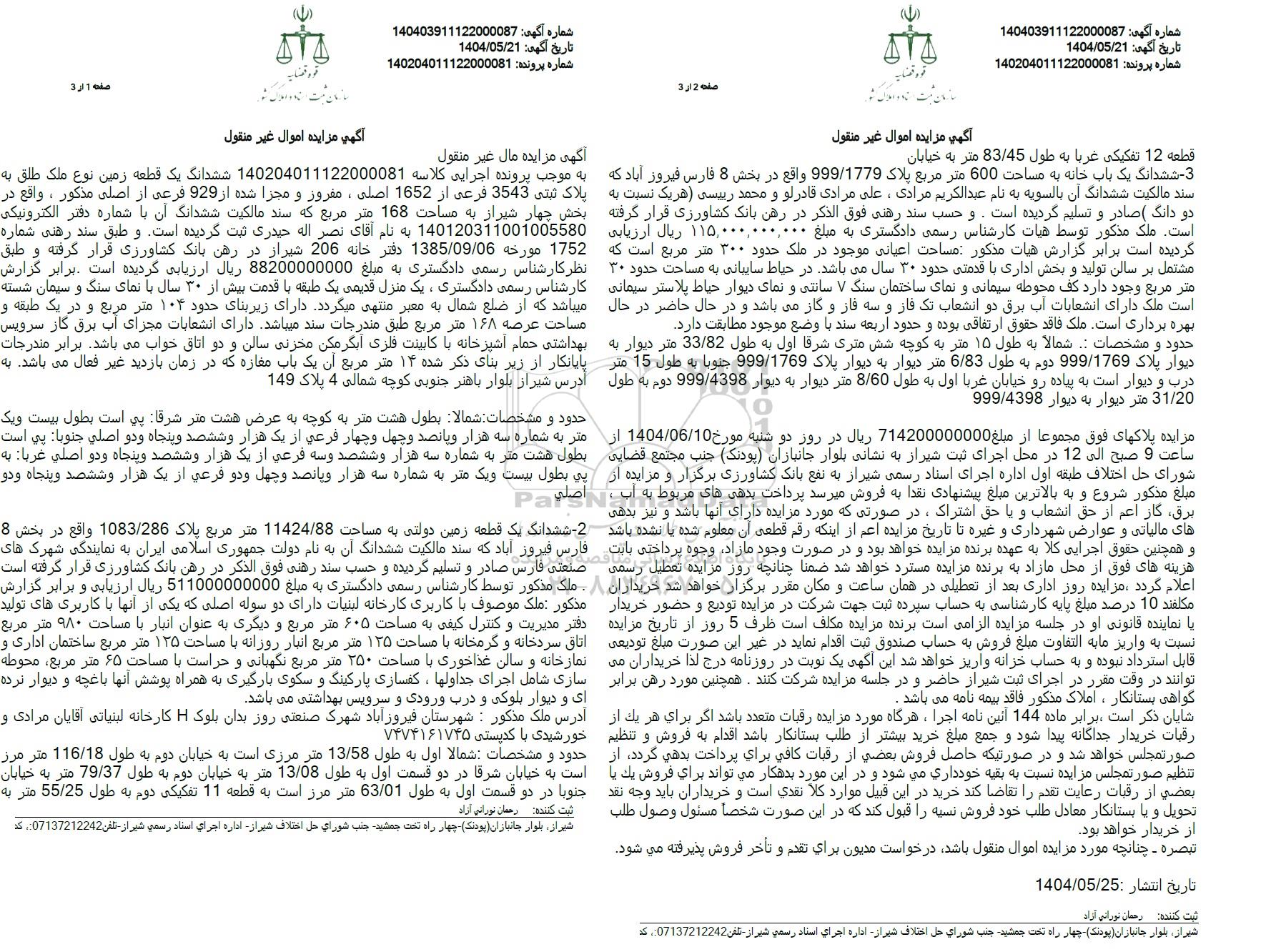 تاریخ مزایده روز دوشنبه مورخ 1404.06.10 ساعت 9 صبح الی 12 - در محل اجرای ثبت شیراز به نشانی شیراز بلوار جانبازان (پودنک) جنب مجتمع قضایی شورای حل اختلاف طبقه اول اداره اجرای اسناد رسمی شیراز